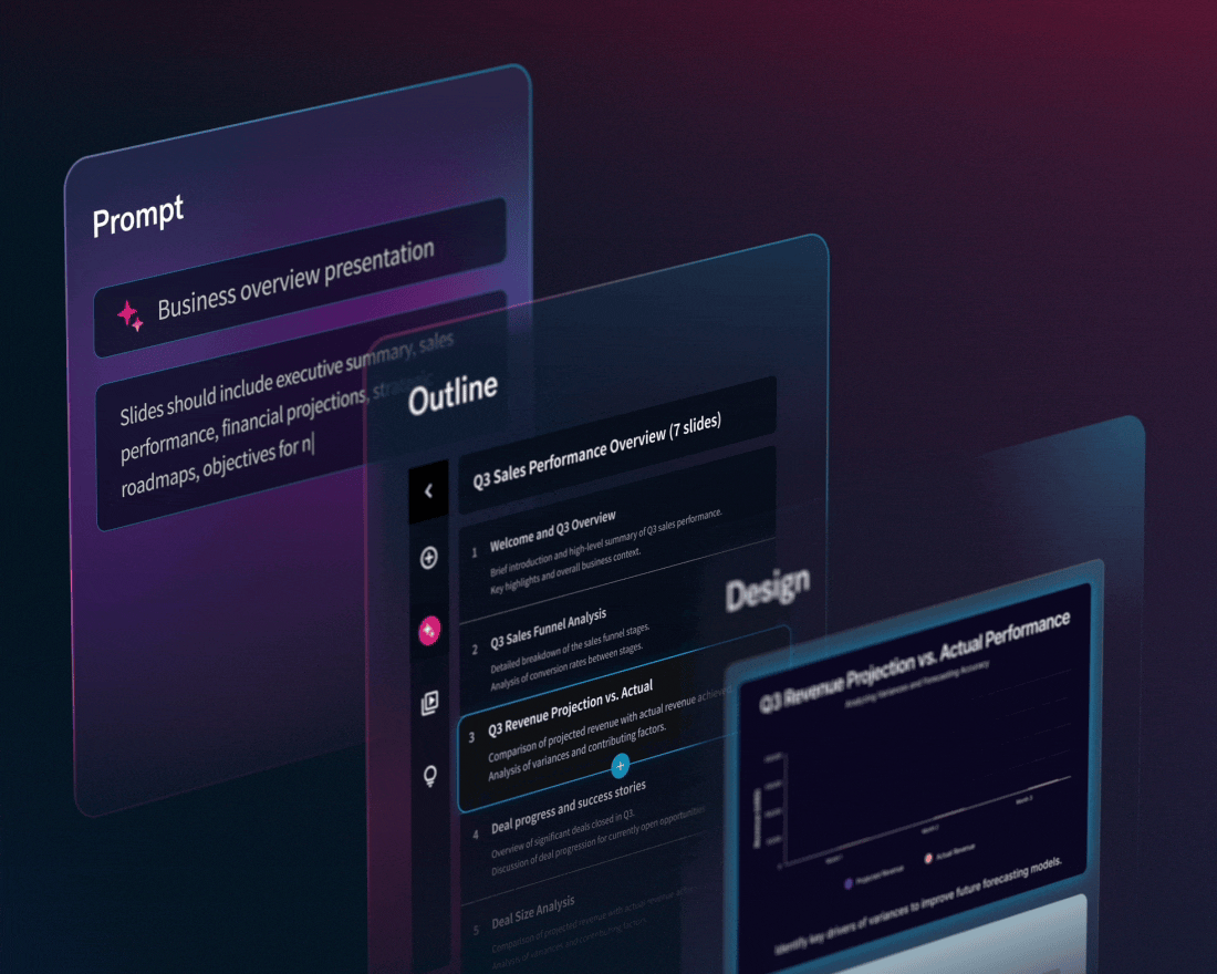 Kickstart your ideas with AI. Just enter a prompt, add extra context, and get a beautiful presentation in seconds.