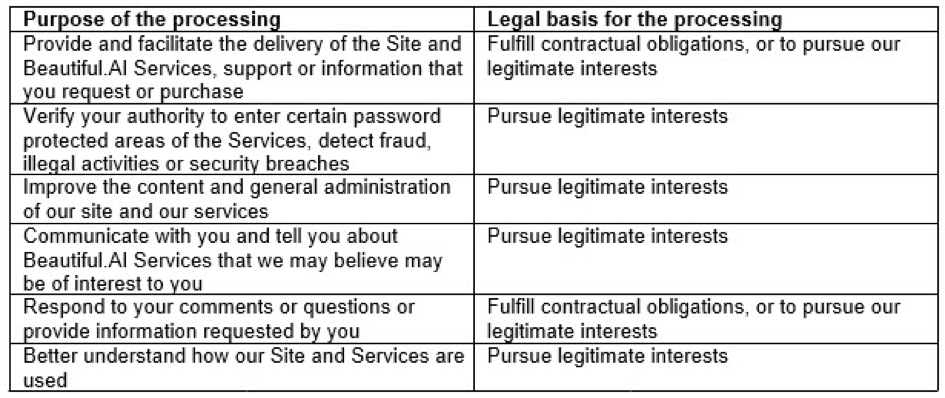 As between the Customer and us, the Customer is the “data controller” and Beautiful.ai is the “data processor” as those terms are defined under the GDPR. If you are an Authorized User, you should contact the Customer to exercise your rights under GDPR with respect to your personal data they may control in connection with your use of the Services as an Authorized User of the Customer’s Account. If you contact us, note that we may forward your request to the Customer.